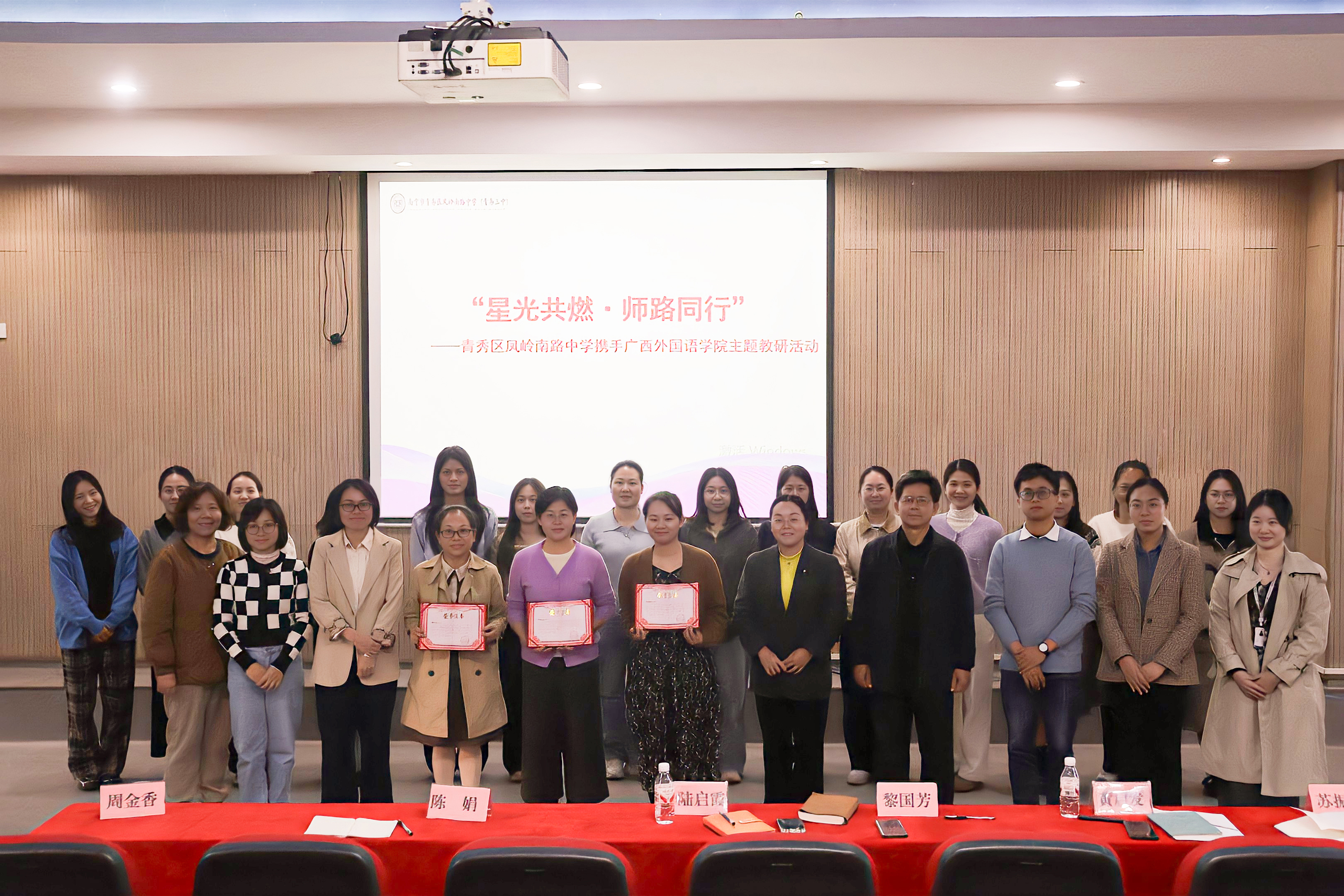 为深化高校与基础教育的衔接,探索协同育人新路径,11月27日,我院与南宁市青秀区凤岭南路中学联合举办的“星光共燃·师路同行”主题教研活动在凤岭南路中学多媒体教室举行。此次活动旨在搭建理论与实践交融的桥梁,共促英语专业学生成长,点亮教育路上的熠熠星光。