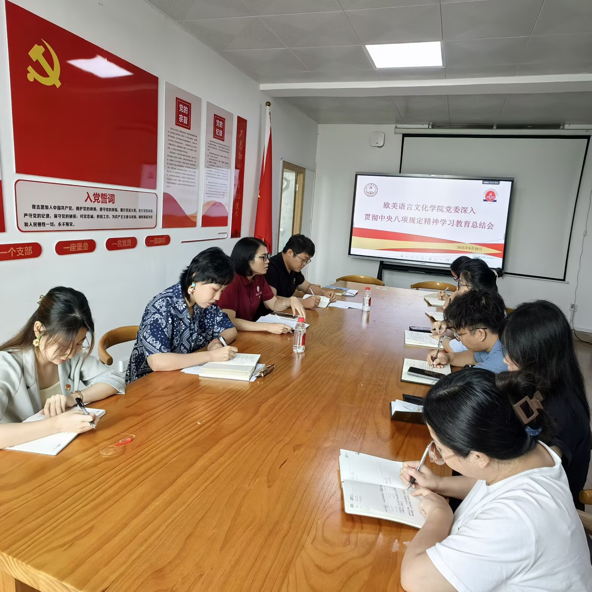 9月29日,欧美语言文化学院党委在明德楼513会议室召开深入贯彻中央八项规定精神学习教育总结会,全面回顾和总结学习教育开展情况,对巩固拓展学习教育成果、推动作风建设常态化长效化进行部署。学院全体党委委员、各党支部书记参加会议,学院党委书记黎国芳主持会议。