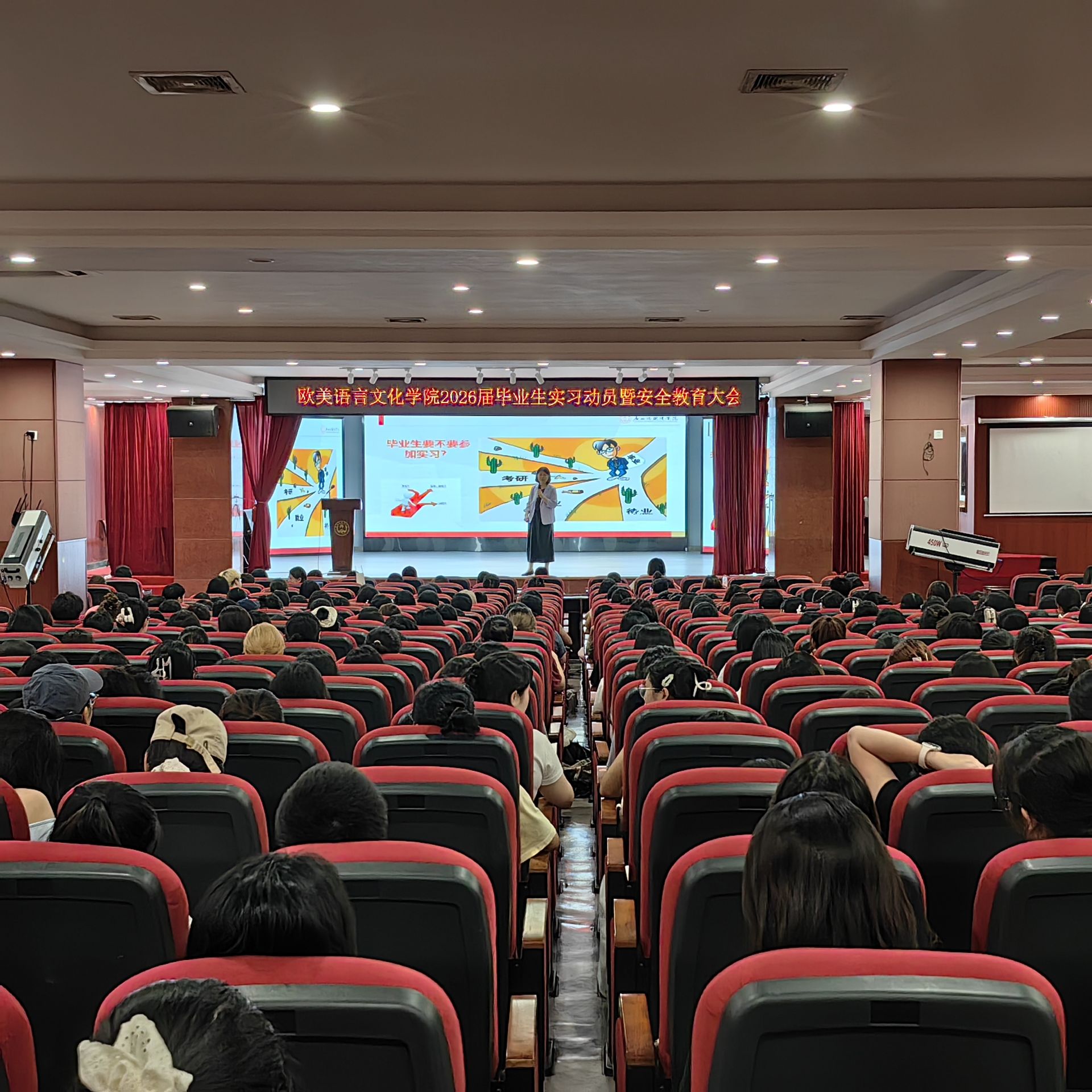 为引导2026届毕业生明确实习目标与意义,确保实习工作安全、有序、高效开展,10月14日,我院召开了2026届毕业生实习动员暨安全教育大会。学校督导团总督导、欧美语言文化学院院长宋亚菲教授,学院党委书记黎国芳同志出席大会并作讲话,学院相关领导、毕业班辅导员、班主任及全体2026届毕业生参加了此次会议。