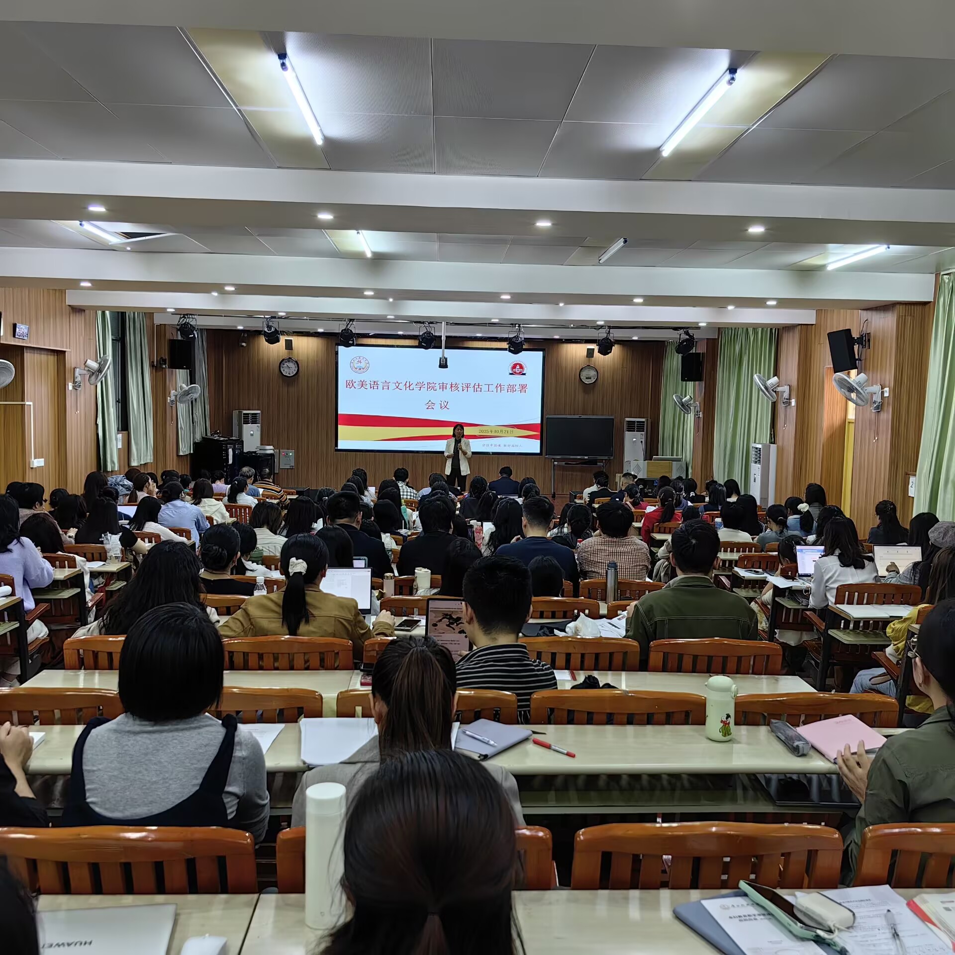 10月21日,欧美语言文化学院召开本科教育教学审核评估工作布置会。学院执行院长陈其乾主持会议并作工作部署,宋亚菲院长出席并作动员讲话,学院各系部主任、专业负责人及全体教职工参加会议,共同迎接本科教育教学审核评估的各项准备工作。