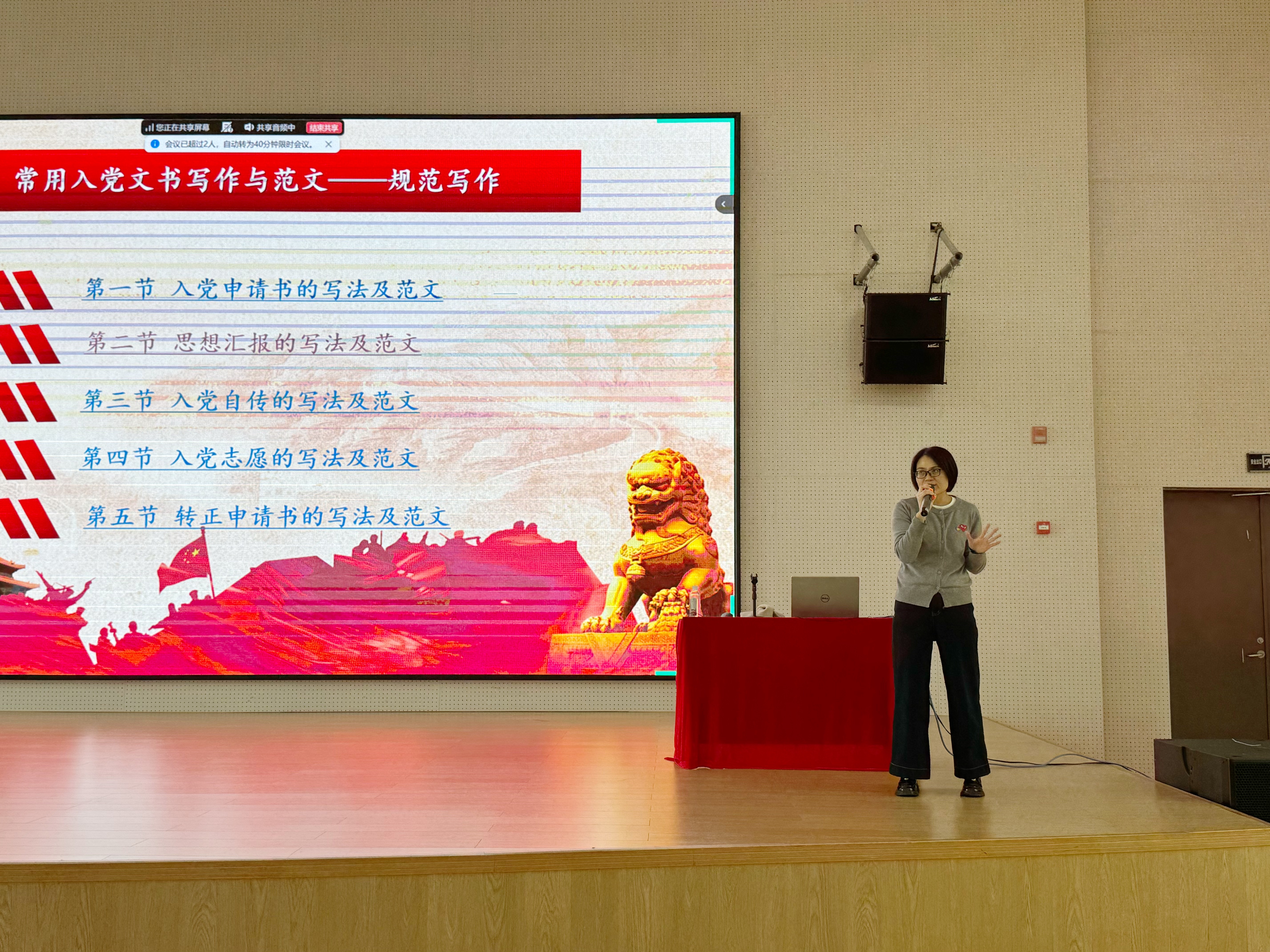 党课上,黎国芳书记紧扣党员发展过程中的关键环节,系统讲解了“入党申请书”与“思想汇报”两类核心文书的写作规范与思想内涵。她强调,这些文书不仅是向党组织表达意愿、汇报思想的正式载体,更是个人思想成长轨迹的真实记录和党组织进行培养考察的重要依据,必须以极度端正和严肃的态度对待。针对入党申请书,黎书记从标题、称谓、正文到落款的格式规范进行了细致剖析,并重点指出,正文内容必须紧密结合个人实际,真诚阐述对党的认识、入党动机、自身表现及未来努力方向,做到认识深刻、情感真挚,杜绝空话套话。在讲解思想汇报时,她特别强调了其定期性、反思性和成长性的特点,指导学员们如何围绕特定时期内的理论学习收获、时事政策感悟、实践锻炼体会以及自我剖析来组织内容,真实反映在党组织培养下的思想进步与蜕变。